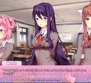 Главная фишка DDLC — мета‑хоррор. Моника оказывается самоосознающей: она понимает, что находится в игре, и обращается напрямую к игроку, используя его настоящее имя в системе. Чтобы пройти игру, приходится лезть в папку установки и вручную удалять её файл — и игра реагирует на это в реальном времени.