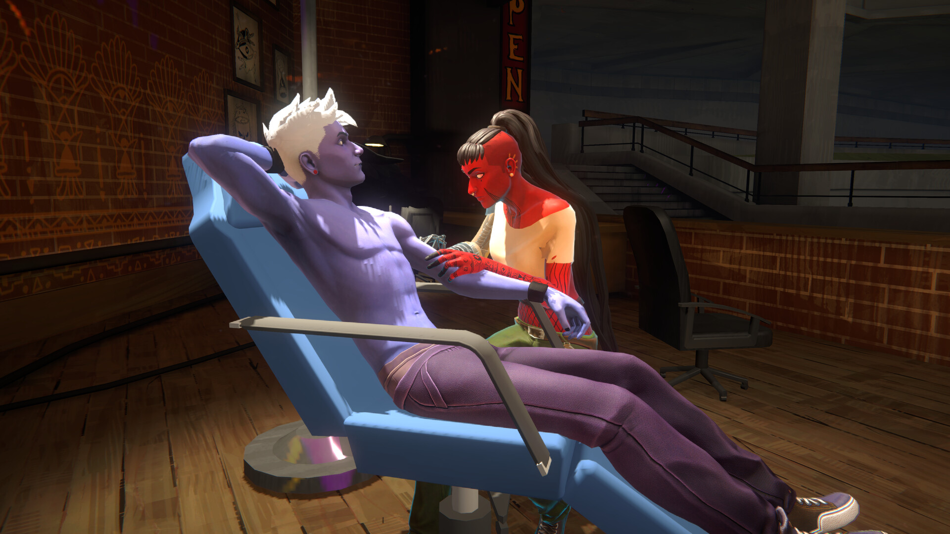 Каждый запуск — это процедурно генерируемые уровни с задачей раздобыть улучшения: оружие, доспехи, виниловые ленты, татуировки — они дают баффы между забегами. Прогресс через перманентные усиления позволяет экспериментировать со стилем: можно быть ядовитым, электризующим или поджигать врагов. Важен навык — нужно кататься, уворачиваться и наносить удар, сохраняя комбо.