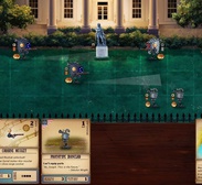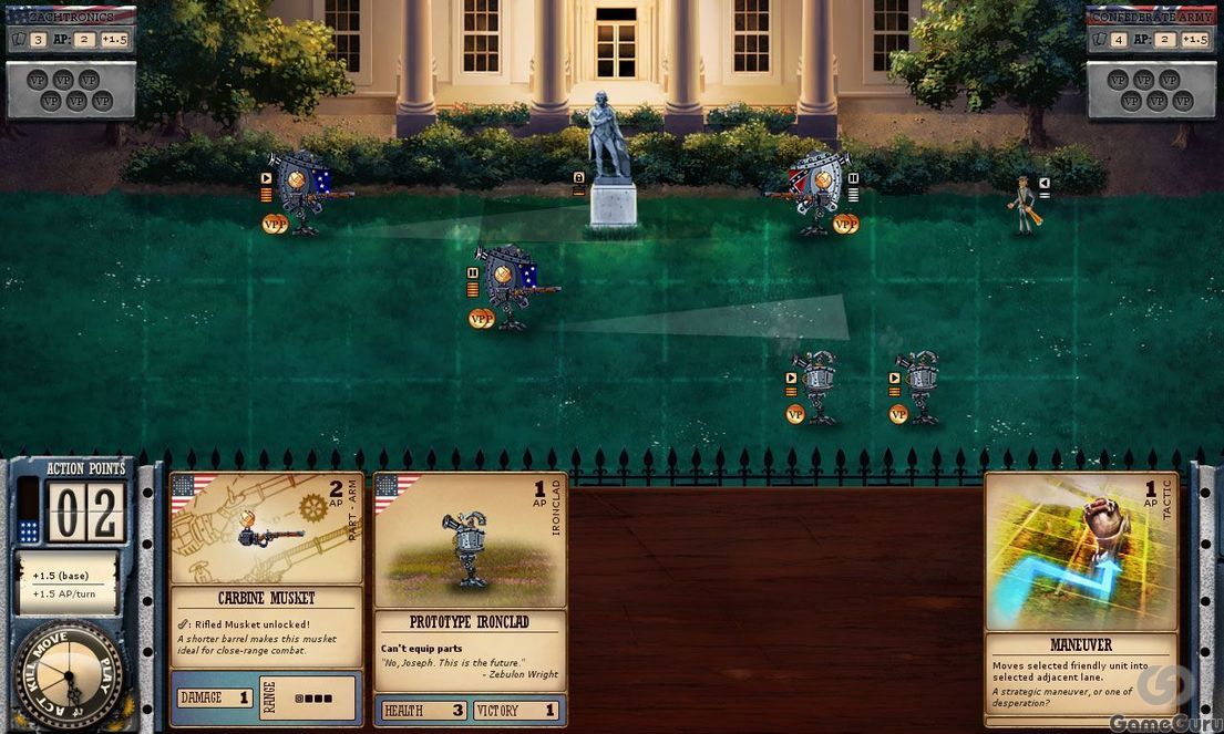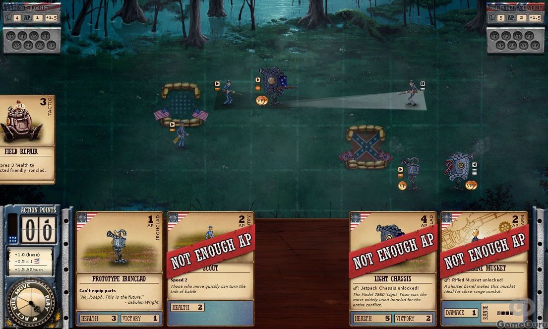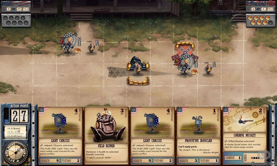 Это карточная стратегическая игра в реальном времени, в которой армии ретро-роботов маршируют по карте с сеткой, а игроки тратят очки действий на карты, которые вооружают их, перемещают, ремонтируют и вводят в бой новые боевые единицы. На самом начальном уровне у вас есть титулованные “железяки” – портативные автоматы, которые приносят вам победные очки, если им удается дойти до другого конца карты. Затем есть пехота, которая может захватывать участки карты, но не получает победных очков и может быть кроваво раздавлена при столкновении с металлической военной машиной. Разные карты обладают различными способностями – например, разведчик коренных американцев, который может быть улучшен, чтобы поменять мобильность на огневую мощь, – и принадлежат к разным фракциям, что ограничивает количество типов, которые можно включить в колоду.