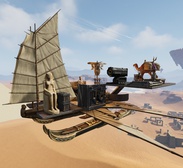 Одно из самых амбициозных нововведений — летающие мобильные базы. Теперь можно строить собственные корабли на антигравитации: от простых деревянных лодок до огромного Falcon‑класса. Эти воздушные суда модульные — их оснащают двигателями, полозьями для путешествий по пескам и тяжёлым вооружением вроде баллист и палубных пушек. По сути, база превращается в передвижную боевую крепость.