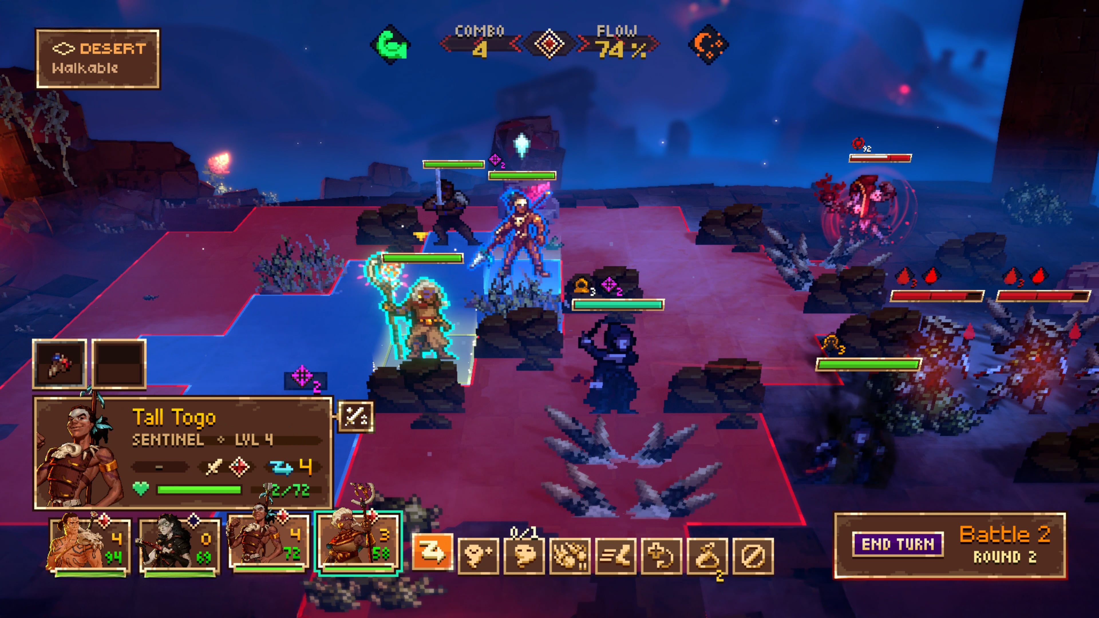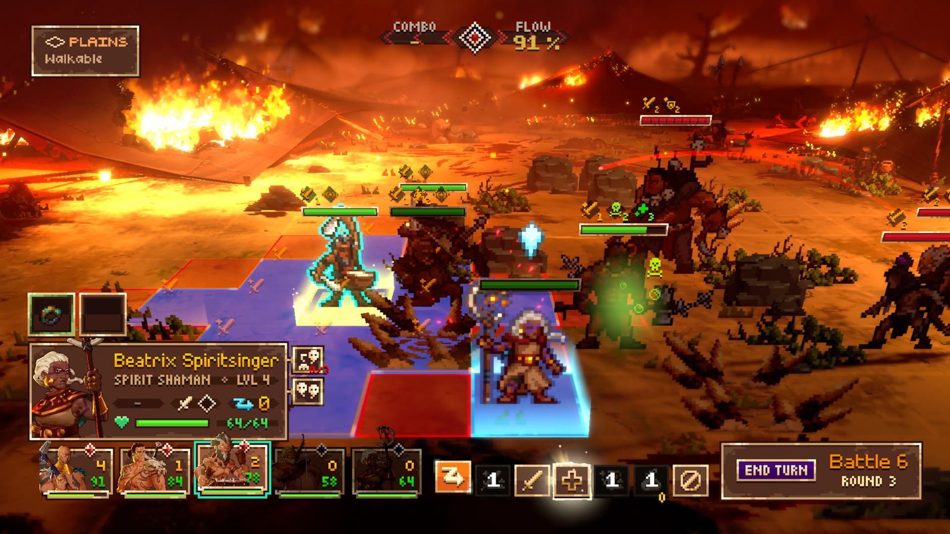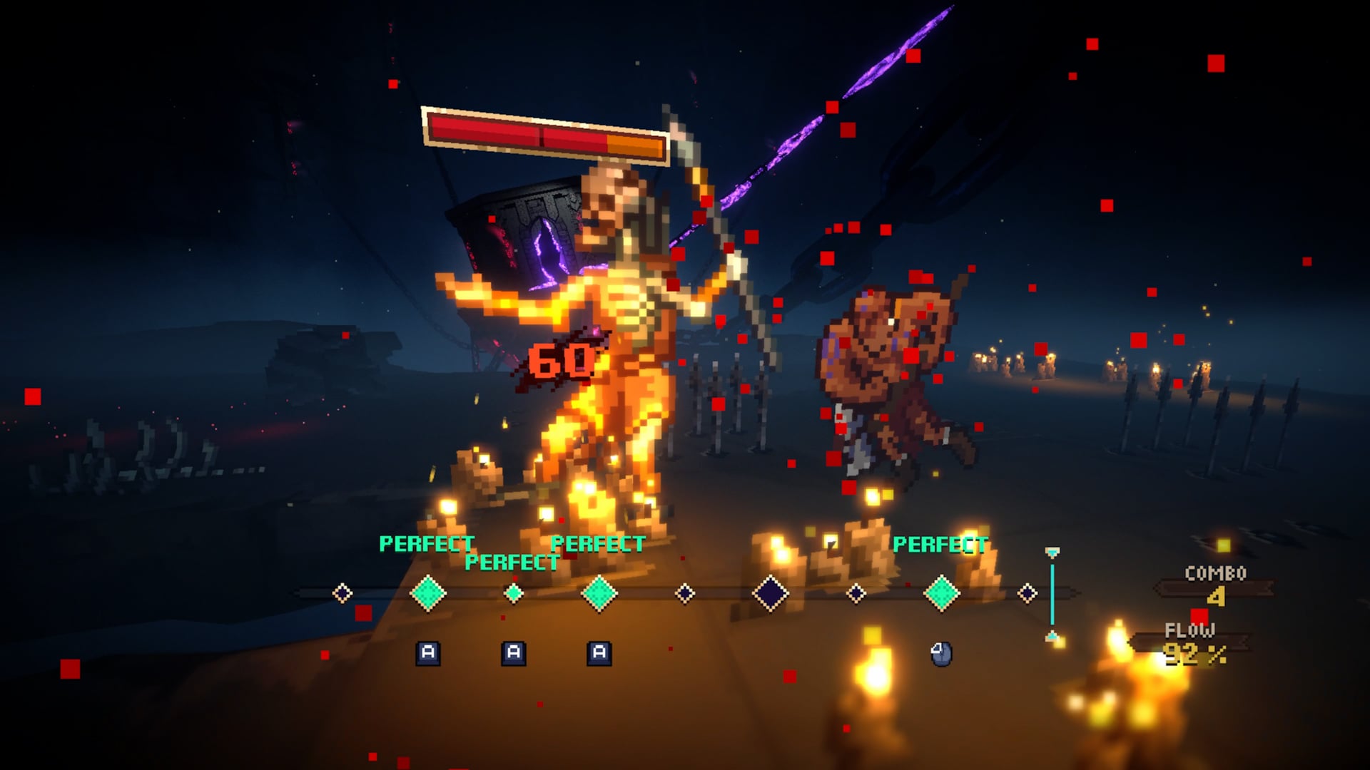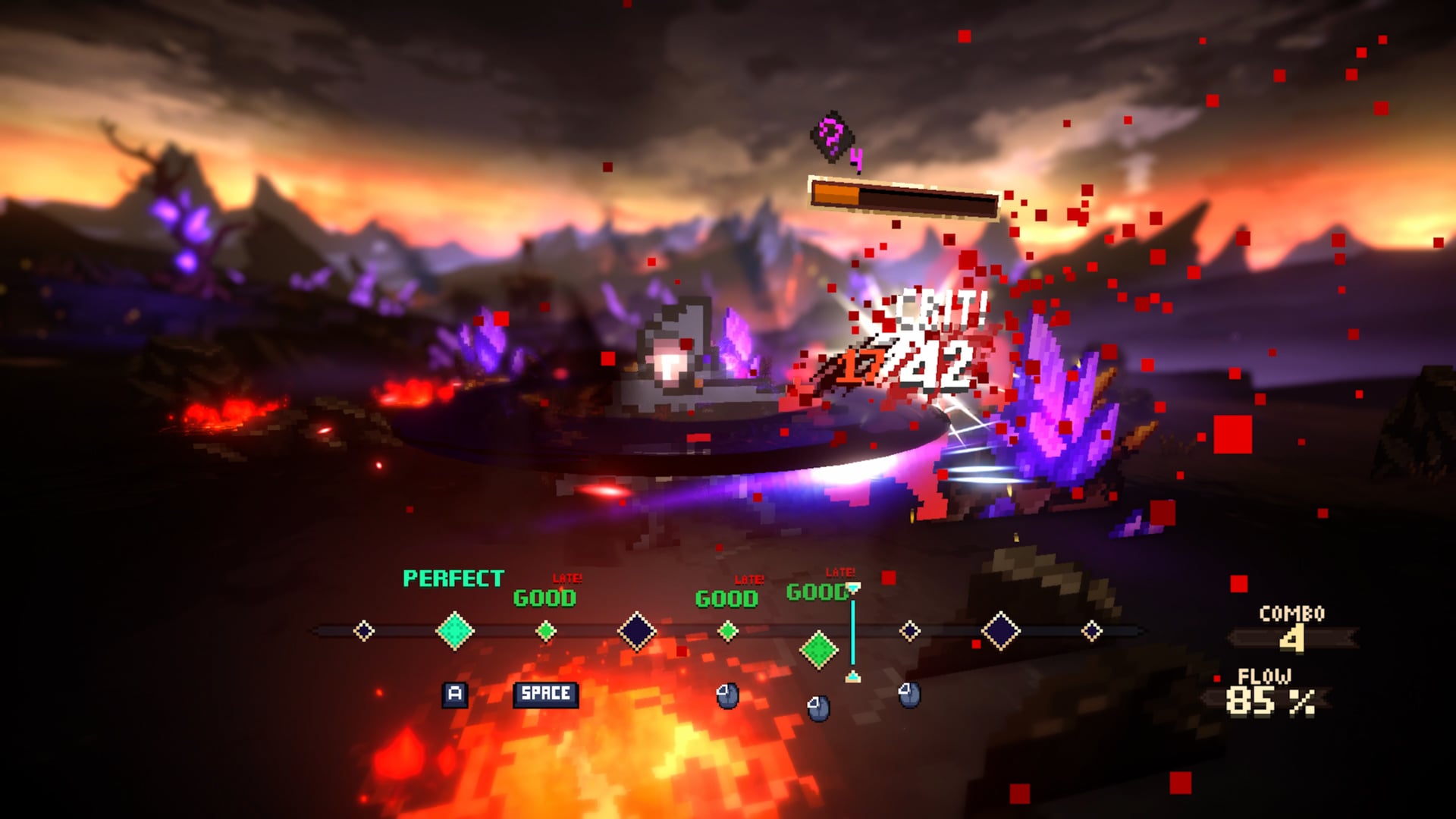 Помимо ритма, здесь полноценная тактика: сетка, фланговые атаки, блоки, overwatch, ловушки и возможность сталкивать врагов в опасные зоны. Как и в любом рогалайте, карты, биомы и встречи генерируются заново, а смерть сбрасывает прогресс, но даёт постоянные улучшения.