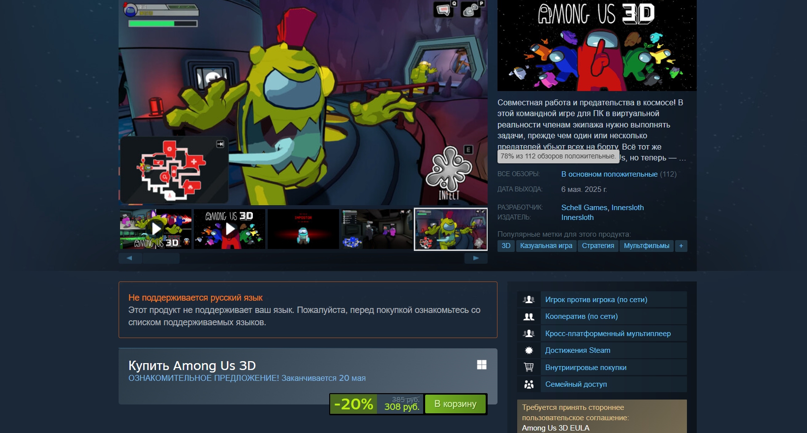 До 20 мая Among Us 3D продают по 20% скидке. С ней она стоит всего 308 рублей