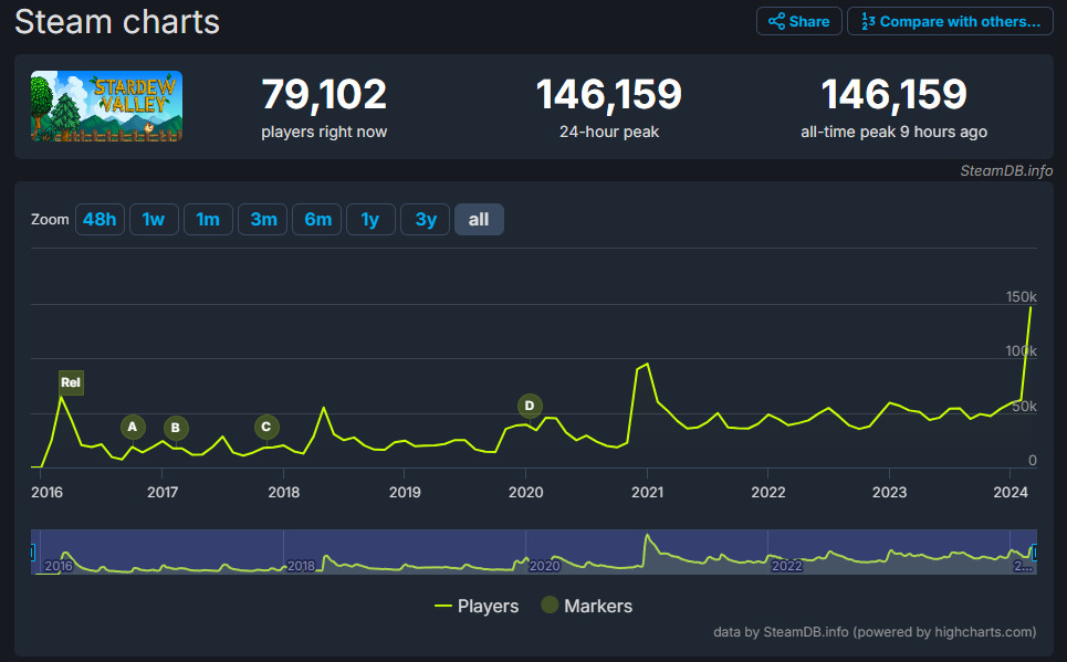 Он превысил 146 тысяч человек. Ранее рекордное число игроков (более 94 тысяч) находилось в Stardew Valley только в январе 2021 года. К сожалению, пока обновление добралось только до ПК — позднее оно выйдет на PlayStation, Xbox, Nintendo Switch и мобильных платформах.
