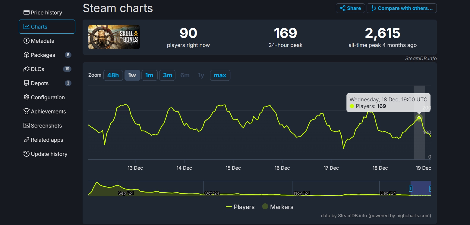 Стоит отметить, что в конце прошлого месяца пиковый онлайн AAAA-игры значительно подскочил в Steam благодаря релизу DLC: он увеличился в два раза, до 300 игроков. Однако уже спустя недели детищем Ubisoft на пике наслаждается 169 энтузиастов: