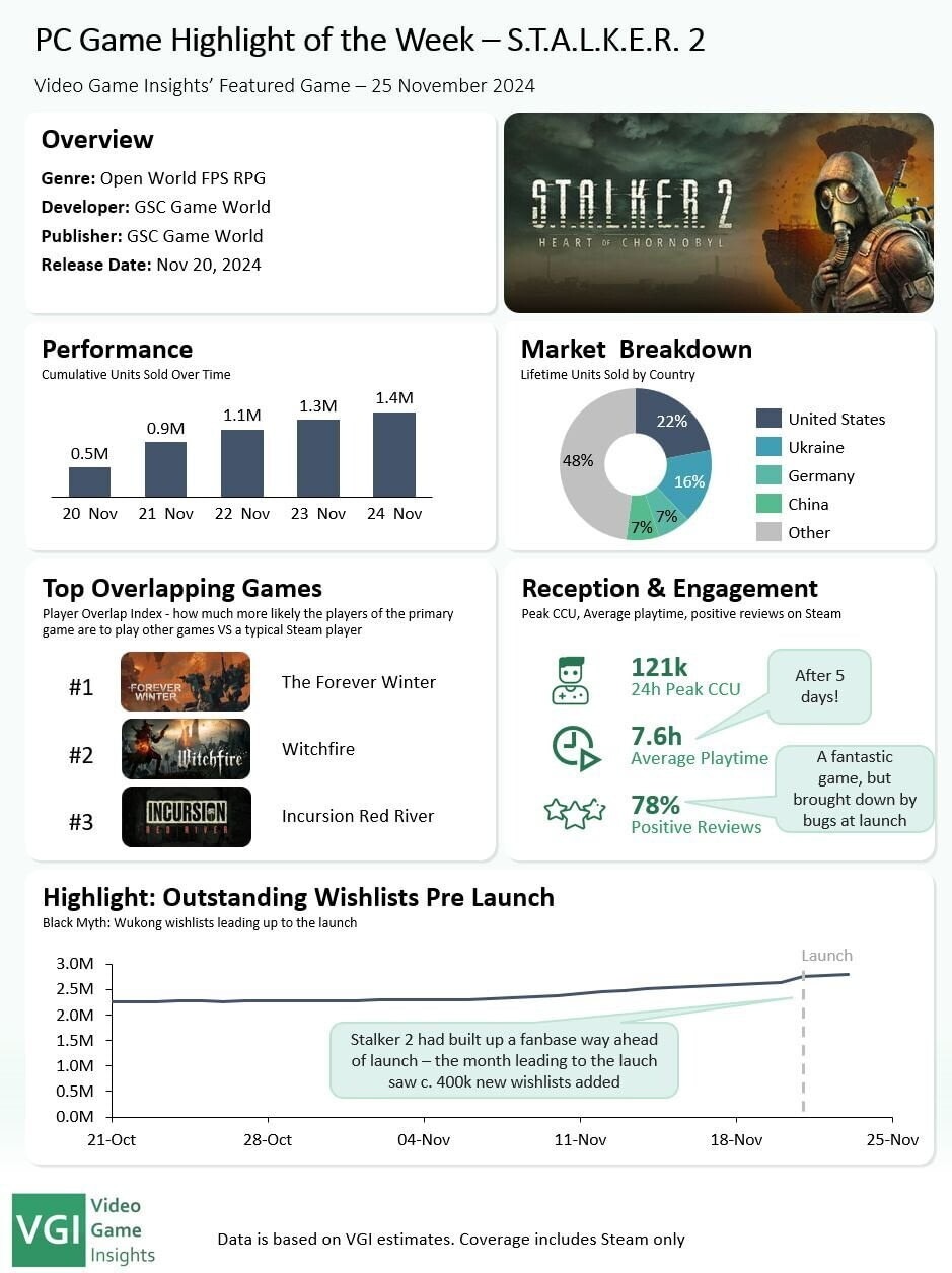 Аналитическая компания Video Game Insights подвела статистику первых пяти дней после релиза S.T.A.L.K.E.R. 2. По данным счетоводов только в магазине Гейба Ньюэлла было продано 1,4 млн копий. Игра также доступна на Xbox, но входит в подписку Game Pass.
