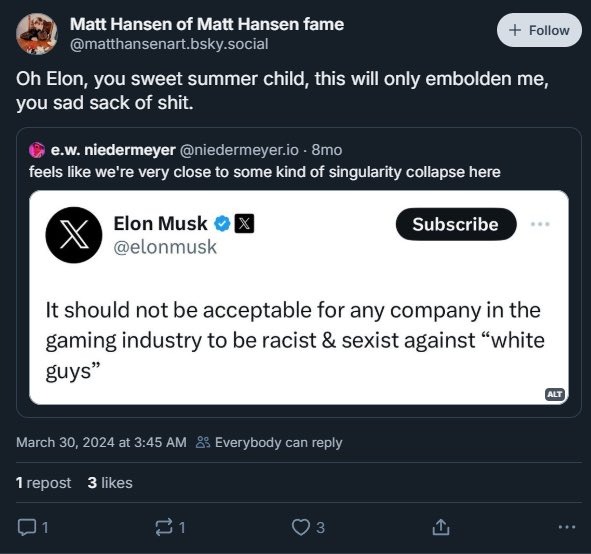 Все старания Obsidian, а также Microsoft, привлечь внимание к Avowed были уничтожены одним днем и одним человеком. Мэтт Хэнсен, арт-директор игры, ответил на обвинение Илона Маска в том, что проект выглядит продвигающим повестку. Ответил грубо, пообещал еще больше повестки, а также заявил, что хочет нанимать чернокожих, потому что в студии слишком много «белых старперов», а сам он хочет научить талантливого черного ремеслу и поставить на свое место, чтобы уйти жить в лес.