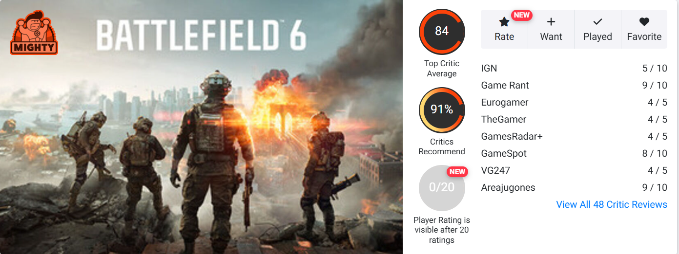 GameSpot поставил 8 из 10, подчеркнув, что игра «играет на безопасном поле, но возвращает серии ее фирменный хаос и масштаб». VG247 в своей рецензии пошла еще дальше, заявив, что Battlefield 6 «наконец-то нашла золотую середину между неповоротливыми тактическими шутерами и ежегодным конвейером Call of Duty».