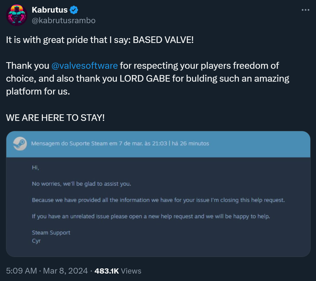 Пользователь соцсети X под ником Kabrutus, который является создателем страницы куратора в Steam, где публикуются названия игр, созданных с участием Sweet Baby Inc, показал ответ службы поддержки сервиса. Судя по всему, страницу закрывать не собираются.