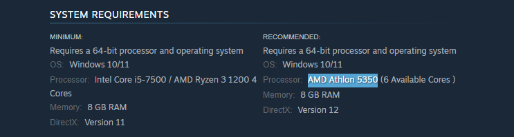 Помимо этого, удивляют и системные требования. Похоже, что они пока что, мягко говоря, неполные — в минимальных и рекомендованных параметрах отсутствует упоминание видеокарты как таковой, а для комфортной игры якобы хватит процессора AMD Athlon 5350, вышедшего в 2014 году.