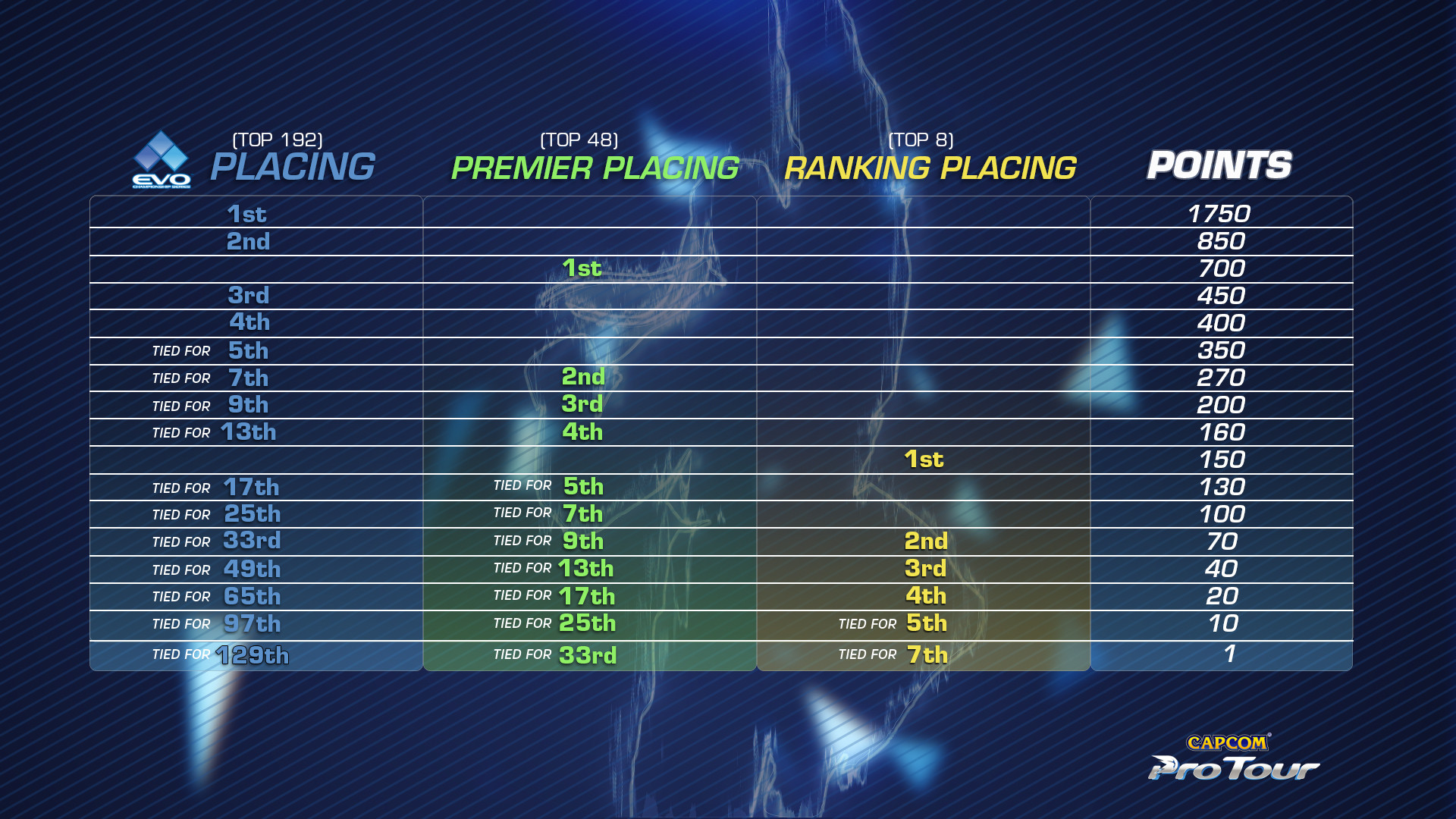 Как и в Dota 2, спортсмены по Street Fighter 5 получают очки, занимая призовые места в официальных турнирах. Соревнования делятся на три типа (от крупного к малому): единственный в своем роде EVO, серии премьер-состязаний и ранговых ивентов. Победа в более престижных соревнованиях дает больше очков Capcom Pro Tournament, из которых складывается мировой рейтинг киберспортсменов.
