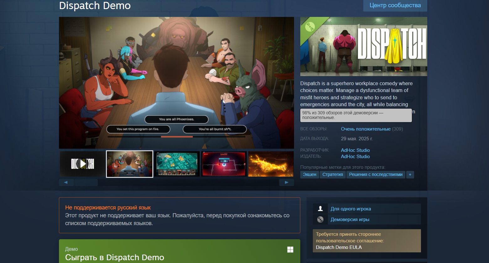 29 мая в Steam вышла бесплатная демоверсия Dispatch, предстоящего комедийного менеджера про геройско-злодейские будни от разработчиков Tales from the Borderlands и The Wolf Among Us. Геймеры горячо встретили раннюю версию проекта команды AdHoc Studio, отметив юмор, «отличную графику, хорошо прописанные диалоги», химию между персонажами, а также «знакомый вайб от игр Telltale». За три дня пробник получил свыше 300 отзывов при рейтинге в 98%: