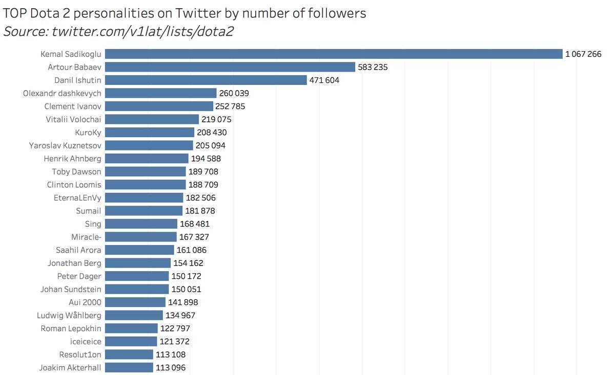 Главный и единственный критерий — последователи-подписчики в Twitter. Самым читаемым оказался Кемаль Садикоглу — генеральный директор организации Dynasty Gaming, в прошлом возглавлявший клуб Team Secret. На следующей строке расположился Артур Arteezy Бабаев из Evil Geniuses, ставший самым известным киберспортсменом. Вторым по популярности про-игроком признали украинца Даниила Dendi Ишутина из Na’Vi.