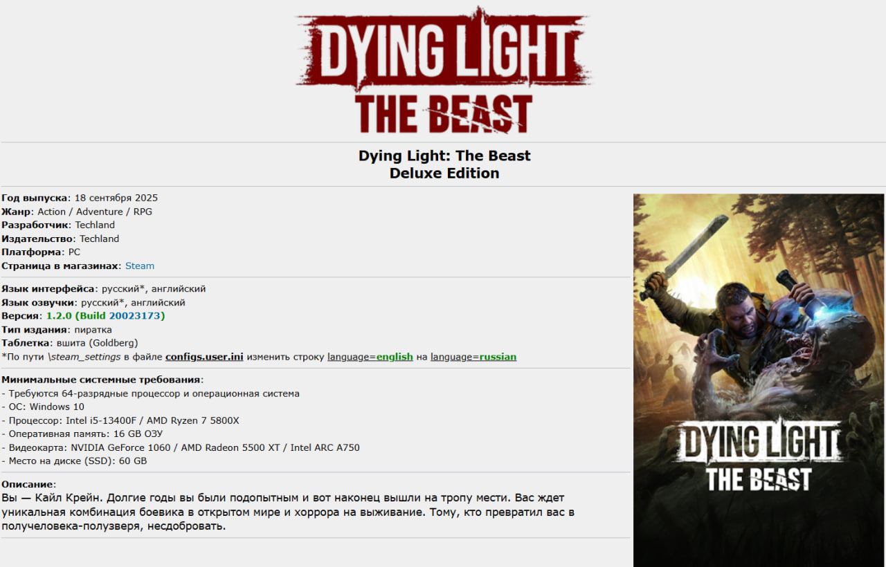Dying Light: The Beast оказалась на торрентах в момент релиза. У зомби-паркурного экшена не было Denuvo. Единственная радость для обладателей лицензии лишь в том, что игра обошлась без раннего Deluxe-доступа, поэтому пираты наслаждаются новинкой одновременно с теми, кто приобрел ее официально.