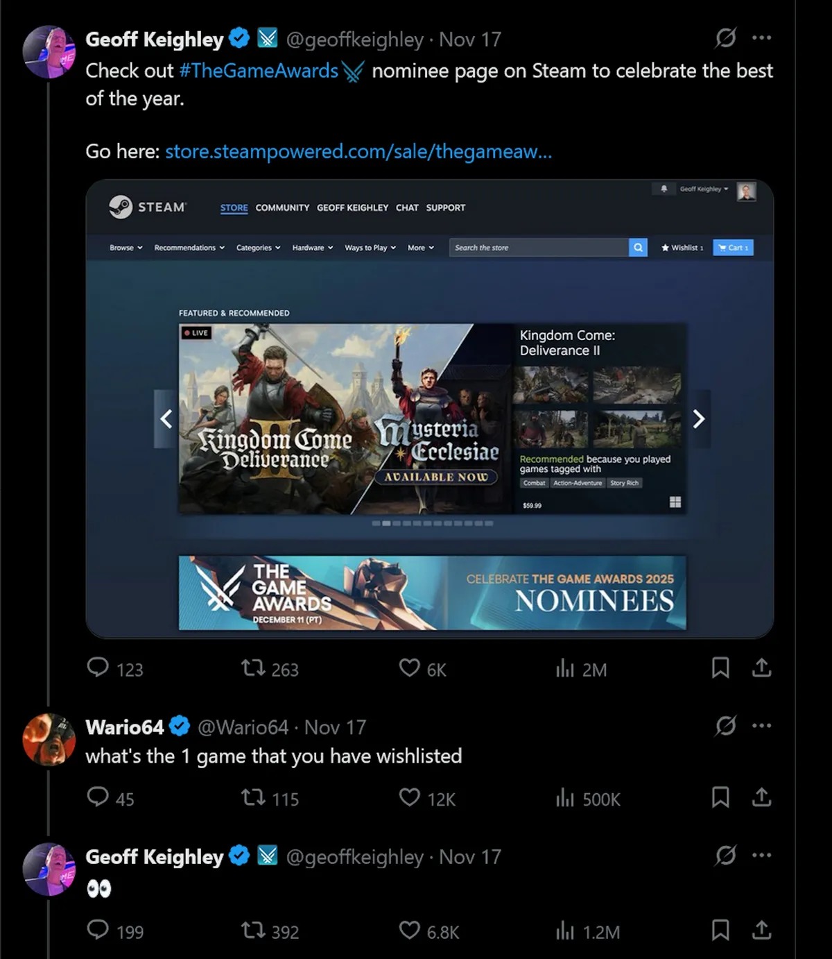 Вся шумиха началась невинно. Кили запостил в соцсетях скриншот главной страницы Steam, призывая фанатов оценить страницу номинантов The Game Awards. Однако орлы из геймерского сообщества, включая популярного блогера Wario64, моментально заметили, что Кили авторизован и у него в вишлисте находится всего один тайтл. Учитывая, что эта история развернулась как раз в районе 18 ноября, когда все ждали анонс, фанаты Half-Life предсказуемо увидели в этом знак, что «та самая» третья часть может быть скоро анонсирована.