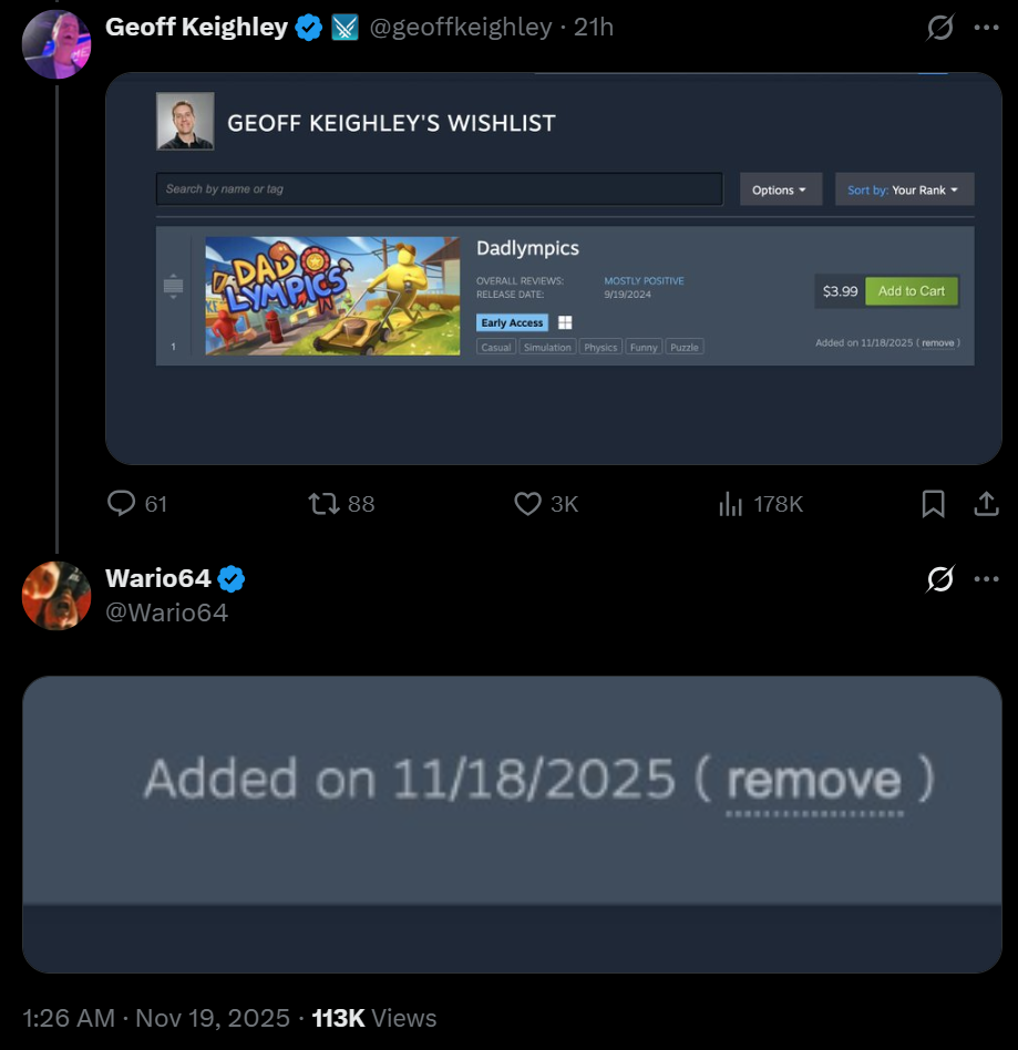 Спустя сутки Кили попытался развеять слухи. Он показал скриншот, где видно, что единственная игра в его вишлисте — Dadlympics, мультиплеерный проект 2024 года, где «папины шутки встречаются с физическим хаосом». Игра вышла в сентябре и собрала пиковую аудиторию всего в шесть человек. Однако этот «разоблачающий» скриншот не потушил пожар, а буквально разжег его с новой силой. Внимательные пользователи заметили, что Dadlympics была добавлена в вишлист Кили 18 ноября — то есть уже после того, как весь сыр-бор начался. Этот факт лишь укрепил подозрения фанатов: очевидно, Кили в последний момент заменил настоящую игру на Dadlympics, чтобы замести следы.