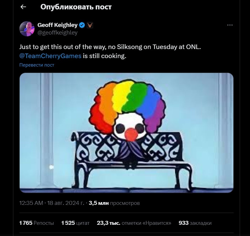 «Просто чтобы прояснить ситуацию, в этот вторник на Opening Night Live не будет Silksong. Team Cherry Games по-прежнему готовит игру»