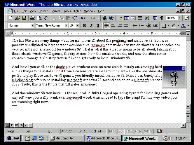 Правда, даже установить Windows 98 на Xbox непросто — сначала ставится RetroArch, затем DOSBox, и только затем уже сам Windows 98. После этого журналисты занялись установкой софта на консоль, который тоже нужно было перенести на ее жесткий диск — помог FTP. Помимо игр, они попробовали даже Microsoft Office 97, в котором автор видео Алекс Батталия в итоге и написал сценарий ролика прямо на приставке.