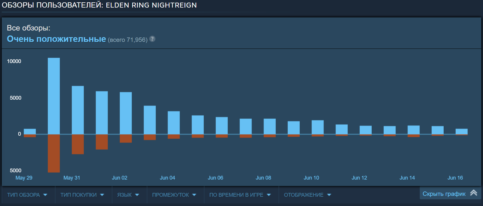 Здесь важно отметить динамику отзывов. Очевидно, что геймеры очень эмоционально отреагировали на что-то незнакомое им — кооперативный «соулс-лайк» с техническими проблемами вызвал бурю негодования. Однако с течением времени игроки стали влюбляться в проект, а патчи сделали свое дело, к счастью, хорошее. С течением времени число негативных отзывов стало снижаться, а положительные рецензии и подвинули Nightreign в зону «очень положительных».