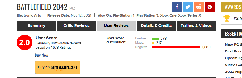 В 2022 году Electronic Arts еще не выпустила ни одной крупной новой игры и продолжает разгребать последствия релиза не самой удачной Battlefield 2042, выпущенной в ноябре прошлого. Ранее в этом году EA признала, что шутер «не нашел отклика у фанатов». Это подтверждает и реакция на Metacritic, где Battlefield 2042 имеет пользовательский рейтинг 2.0 и почти 4 тысячи негативных оценок.