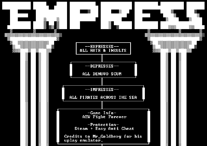 В сопровождающем взлом сообщении EMPRESS не стала объяснять причину, по которой она обошла защиту симулятора реслинга, да еще и без Denuvo. Возможно, она ярко выразилась в каком-нибудь закрытом канале. Может быть, ей стало скучно. Или же, если она русская, то решила взломать AEW из-за воспоминаний, как в детстве смотрела реслинг на ТНТ вместе с Николаем Фоменко.