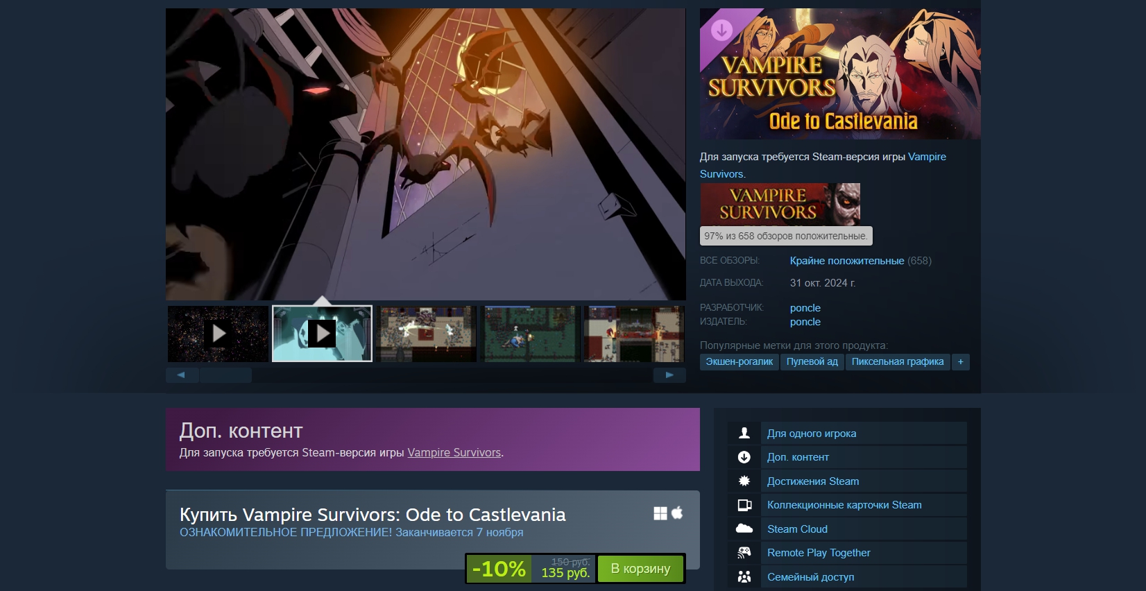 31 октября состоялся релиз Ode to Castlevania, DLC-кроссовера для Vampire Survivors с серией Castlevania. Дополнение привносит в залипательный инди-хит мириады новшеств, среди которых не только именитые герои и оружие, но и «наконец-то возможность поймать... вампира. Наверное».
