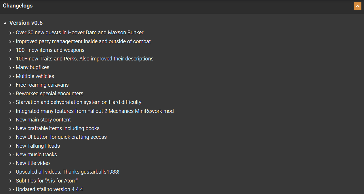 Самая свежая версия — 0.6 — добавляет более 30 новых квестов, 100 новых предметов и видов оружия, улучшает управление командой в бою и вне боя, а также вводит свободно перемещающиеся караваны. Игроков также ждет новый сюжетный контент и новые музыкальные композиции, а на сложности Hard добавлены системы голода и обезвоживания.
