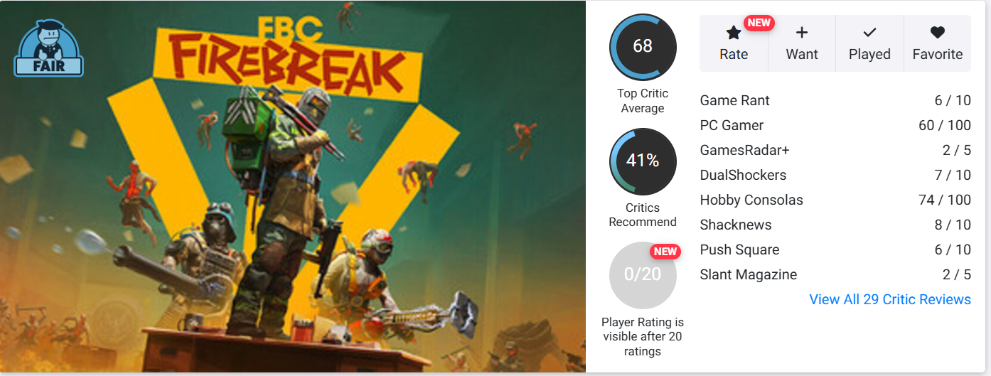 Начнем с отзывов СМИ. По Opencritic игра набрала лишь 68 баллов. И лишь 41% авторов рекомендует поиграть в FBC: Firebreak. По-настоящему разгромных отзывов вроде бы как нет, но критики говорят, что одиночные игры у Remedy получаются лучше. Основные претензии сводятся к скудному разнообразию миссий. Активностей очень мало, а играть нужно часто — прокачка слишком медленная.