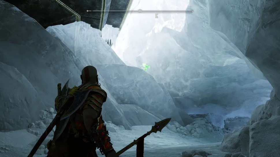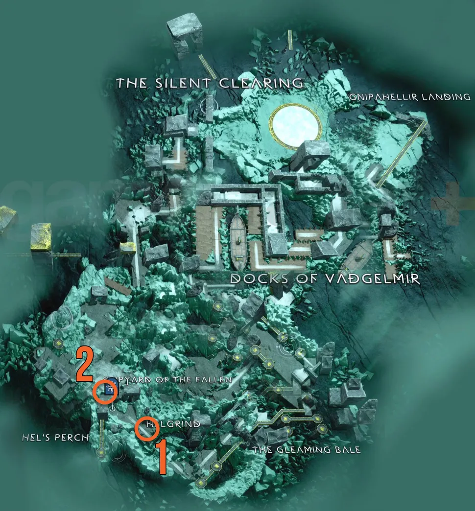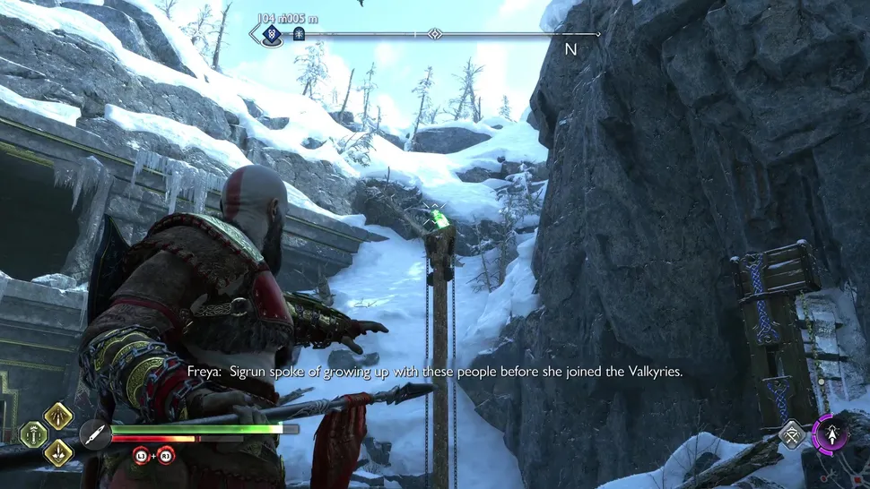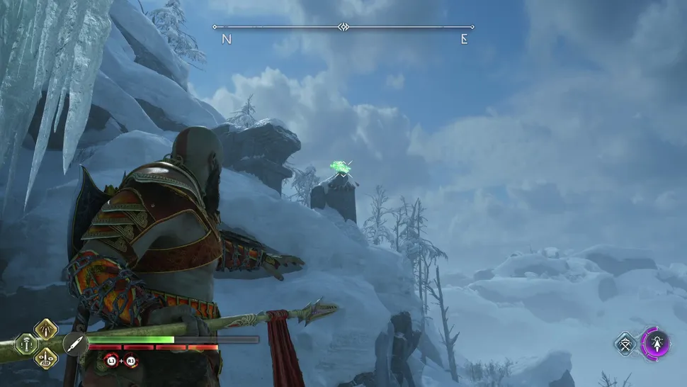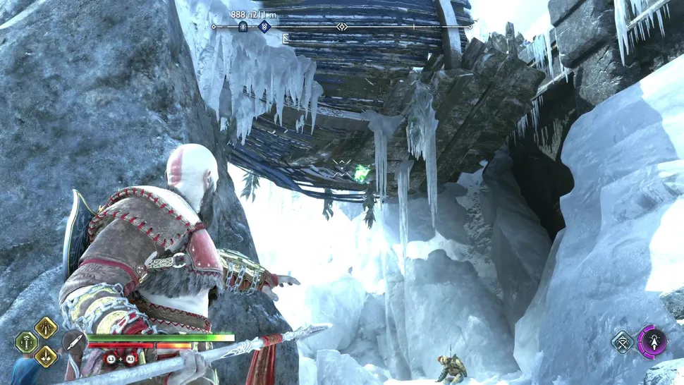 После решения проблем с мега-волком Гармом вам нужно будет покинуть Хельхейм, решив головоломку с дверью, которая требует, чтобы вы использовали топор Левиафана и рунические стрелы Атрея, чтобы заморозить спрятанное снаряжение, чтобы держать дверь открытой. По другую сторону этой двери находится Маркер Знаний, а Ворон сидит прямо над каменной стеной.