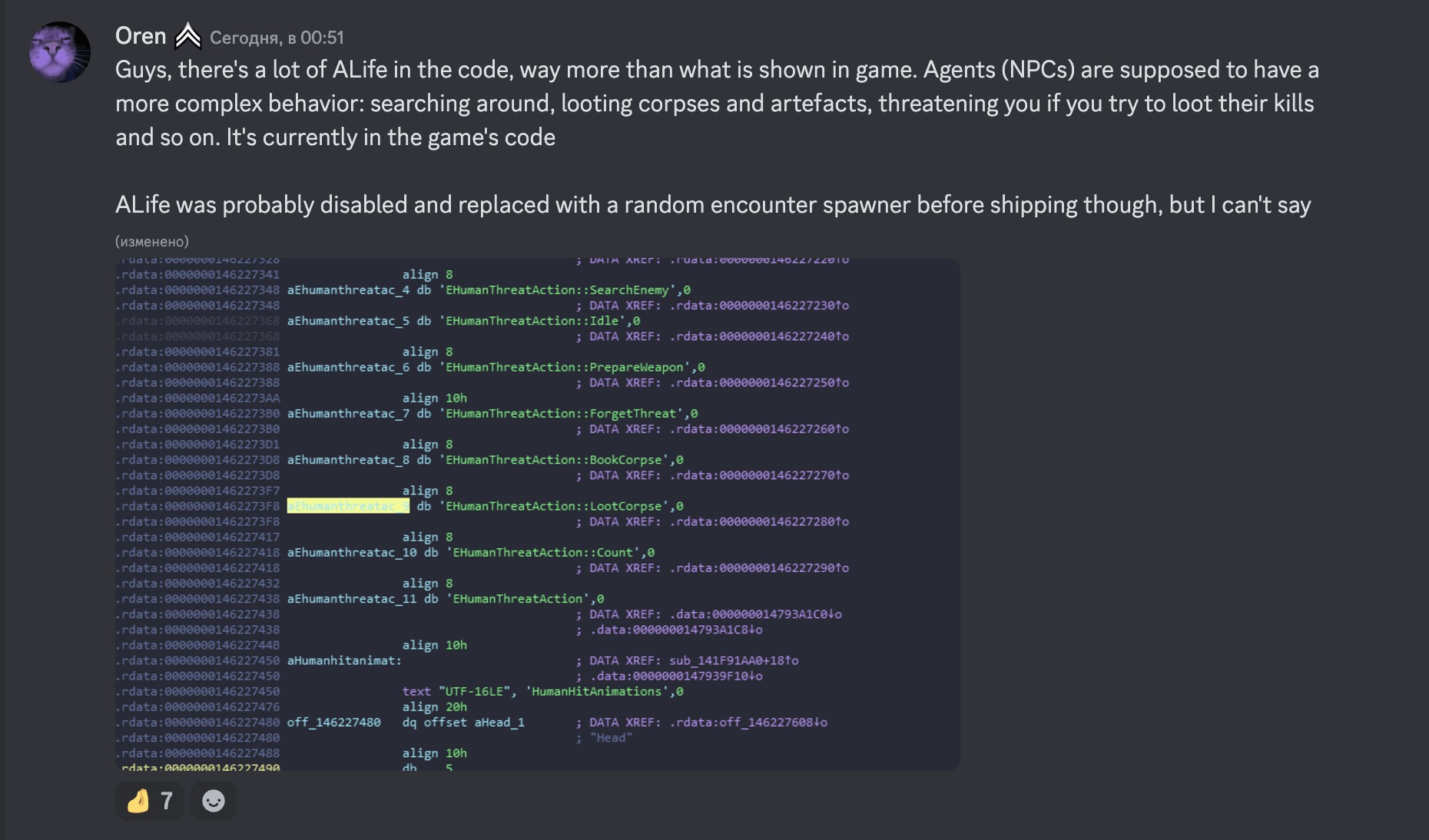 Среди находок — упоминания о ALifeDirector, который создает сценарии, раздает задания агентам (например, отрядам сталкеров) и управляет популяцией фракций, поддерживая ее на определенном уровне. Были найдены типы, связанные с целями фракций (Aggressive, Defensive), базами (Lair), а также действиями агентов: от патрулирования и лечения союзников до паники и обыска тел.