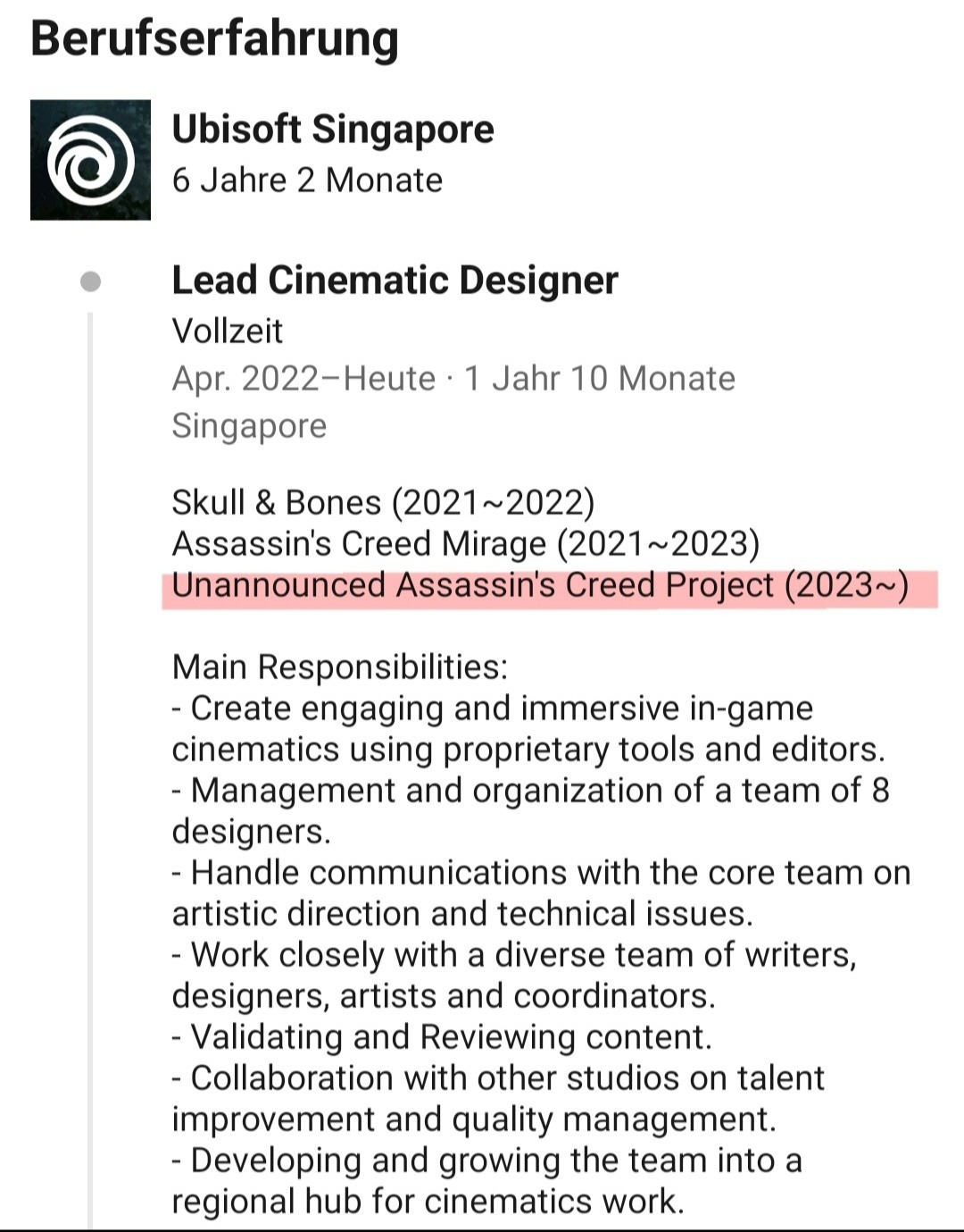 Ведущий дизайнер кинематографических роликов в Ubisoft Singapore с 2023 года трудится над неанонсированным проектом серии Assassin's Creed. На это указывает страница сотрудника в LinkedIn.