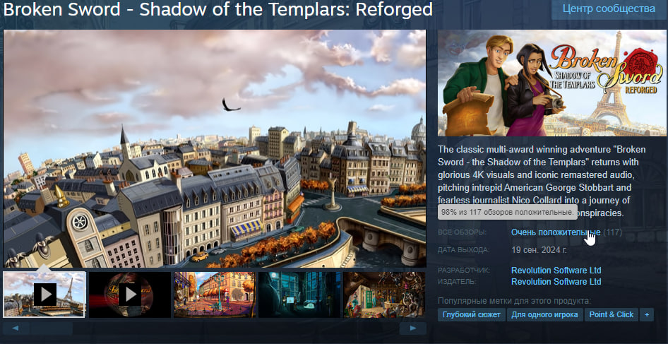 Нечасто ремастер игры становится лучше оригинала, однако и такое бывает. Вышедший 19 сентября Broken Sword — Shadow of the Templars получил 98% положительных отзывов.