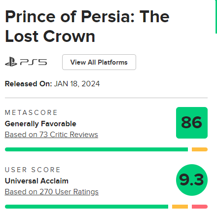 Однако СМИ многие геймеры уже не верят (если только это не GameGuru, конечно). Поэтому в сети ждали оценок от желающих что-то написать игроков. И дождались. Первые рецензенты высоко оценили Prince of Persia: The Lost Crown. На основе 270 отзывов, у игры аж 9,3 балла.