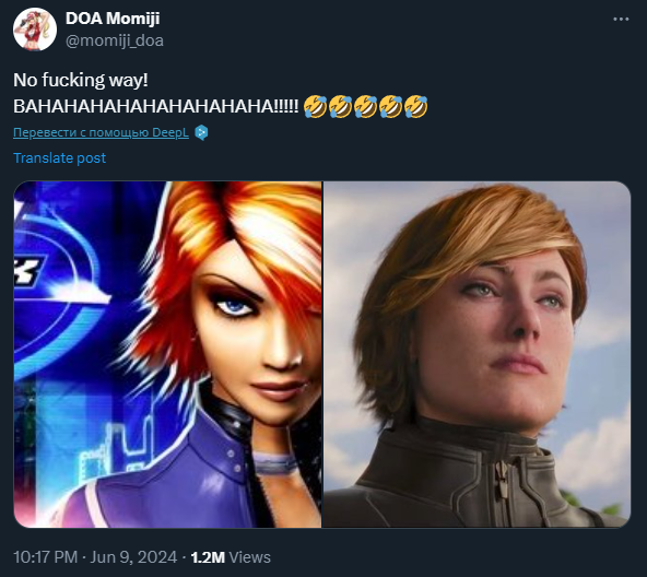 В безумной соцсети X попытались высмеять квадратную челюсть героини Perfect Dark. Джоанну Дарк представили на презентации Xbox 9 июня и кто-то сразу же поспешил сравнить новый образ со старым, подписав фотографии: «Да ладно! Ха-ха-ха-ха-ха-ха-ха-ха!»