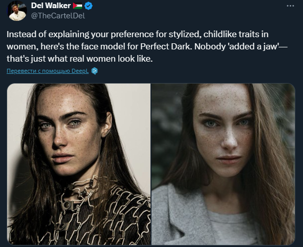 «Вместо того, чтобы объяснять вам, что вам нравятся стилизованные и детские черты в женщинах, я вам покажу настоящую модель для Perfect Dark. Никто не добавлял челюсть, просто так выглядят настоящие женщины», — написал Дел Уолкер и опубликовал фото.