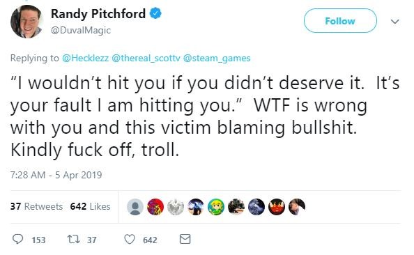 Затем пришел кто-то из сторонников Steam с обвинениями в адрес Питчфорда и ко. Мол, сами виноваты, не надо было принимать предложение Epic Games, на что Рэнди тактично послал гражданина в пешее эротическое.