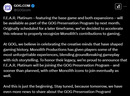 «В GOG мы верим в чествование творческих умов, которые сформировали историю игр. Monolith Productions подарила игрокам некоторые из самых незабываемых впечатлений, смешав новаторский игровой процесс с богатым повествованием. Чтобы почтить их наследие, мы с гордостью объявляем, что FEAR Platinum присоединится к Программе сохранения GOG — и раньше, чем планировалось. И другие иконы Monolith, в конце концов, тоже будут там. И это только начало. Оставайтесь с нами, потому что завтра у нас будет еще больше новостей о Программе сохранения GOG! FEAR Platinum» — из вчерашнего поста Good Old Games.