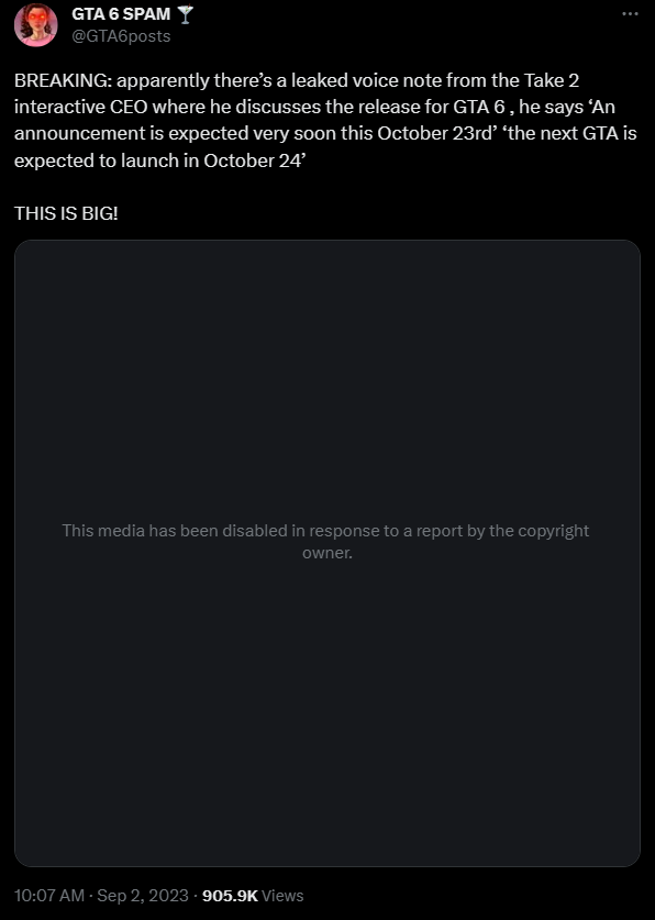 Пользователь @GTA6posts поделился аудио сообщением, в котором человек с голосом, похожим на голос Штрауса Зельника, главы Take-Two, говорит, что Grand Theft Auto 6 анонсируют в октябре 2023-го, а выпустят в октябре следующего года. Геймеры даже не успели толком обсудить эту информацию, как вдруг появилось сообщение о блокировке файла по требованию правообладателя.