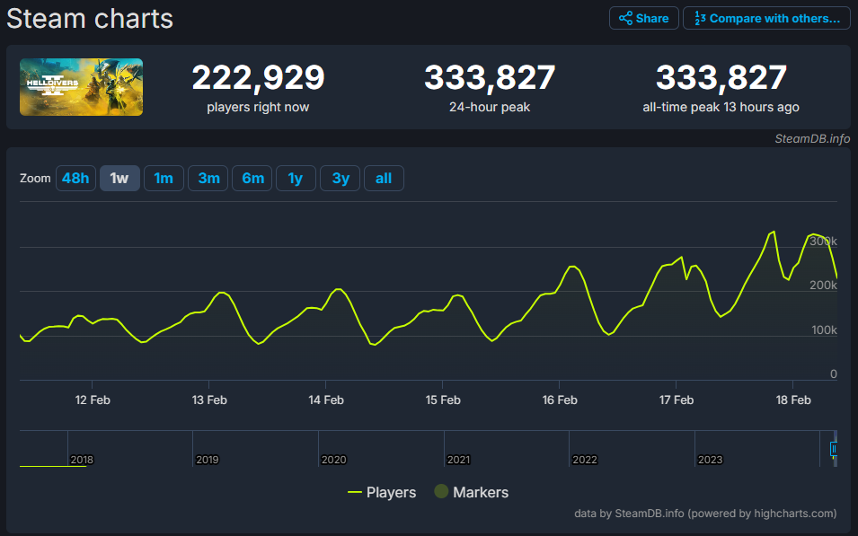 Helldivers 2 продолжает набирать популярность. В субботу, 17 февраля, пиковый онлайн шутера превысил 333 000 человек. Игре удался необыкновенный скачок на 70 000 человек.