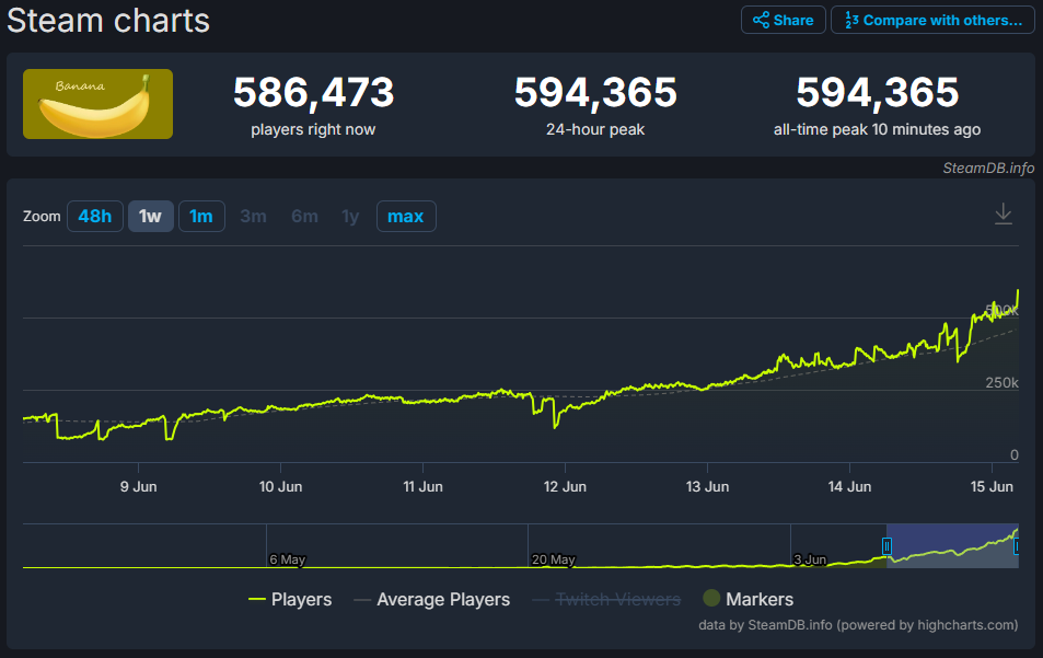На момент написания данной заметки онлайн Banana составлял 586 тысяч человек, а пиковый онлайн приблизился к 600 тысячам.