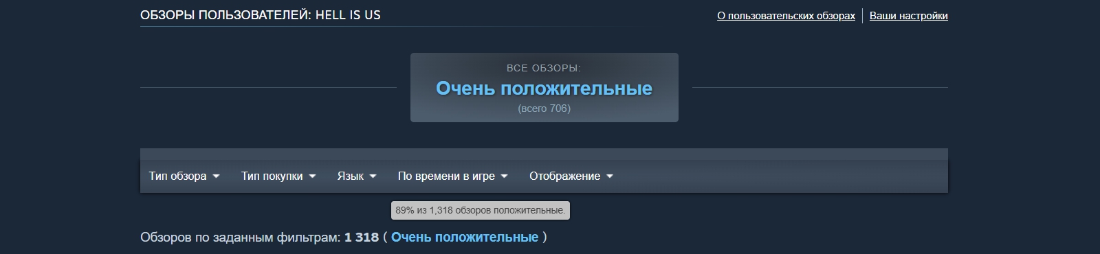 Экшен-адвенчура Hell is Us оставила в основном приятные впечатления не только у прессы, но и у обычных игроков. За почти неделю новинка от команды Rogue Factor и издателя Nacon собрала в Steam свыше тысячи отзывов при рейтинге в 89%. Геймеры хвалят атмосферу и запоминающийся дизайн, но расходятся в оценках игрового процесса и наполнения. Hell is Us называют как «скучным поделием», так и увлекательным экшеном:
