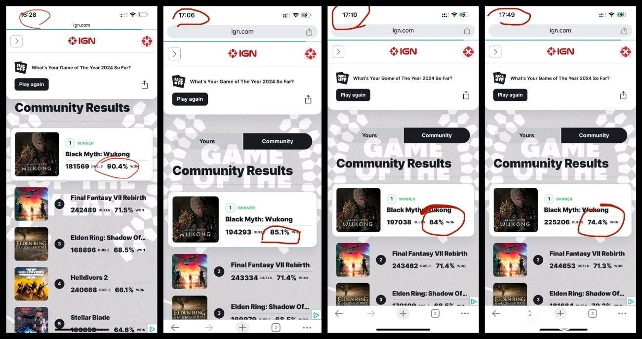 Геймеры в соцсети X заподозрили IGN в подтасовке результатов пользовательского голосования. Недавно на портале запустилась битва игр, с помощью которой редакция собирается выбрать лучший проект 2024 года до череды осенних релизов. Как отметили в сети, Black Myth: Wukong лидировала по состоянию на 16:28. Уже через 40 минут игра потеряла 5%, еще через 4 минуты — 1%, а через 39 минут — еще почти 10%.