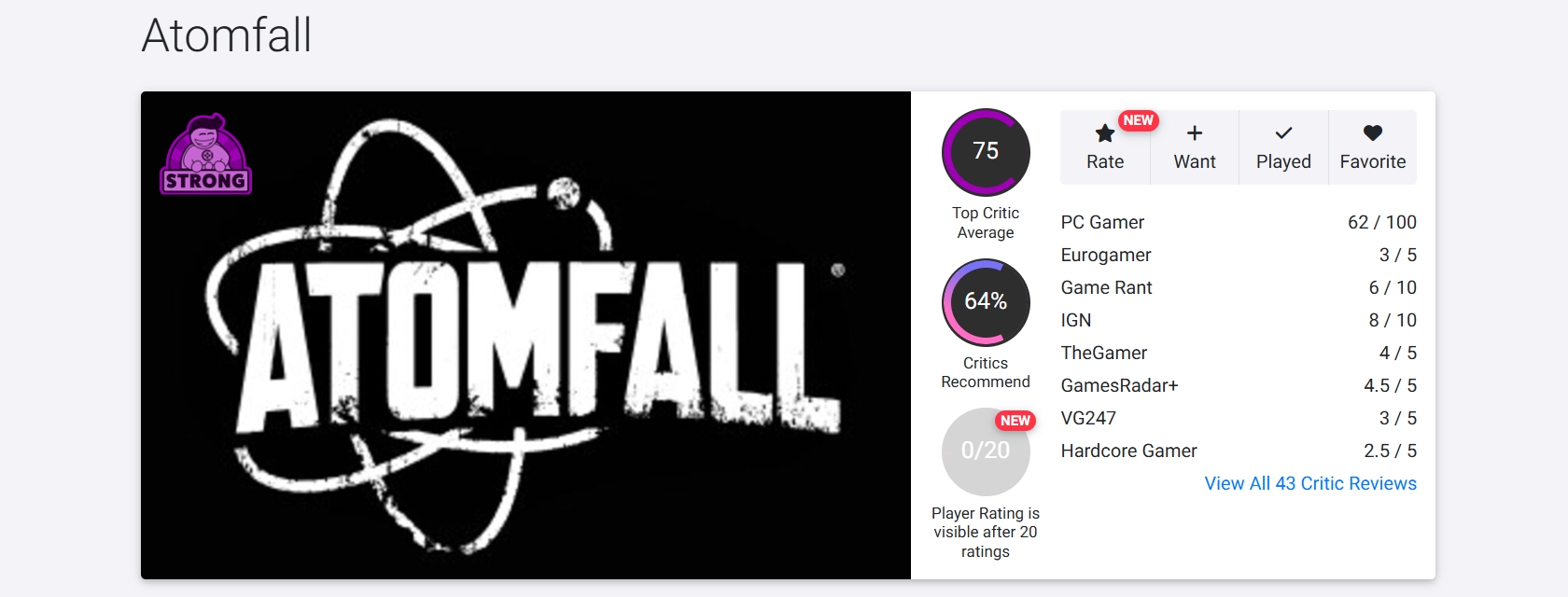 Hardcore Gamer: 5/10. «Atomfall проваливается в своих попытках отдать дань уважения и воссоздать магию других апокалиптических выживачей».