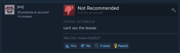 «В игре нельзя заняться жаркой любовью с листьями», — разочарованно подытожил игрок