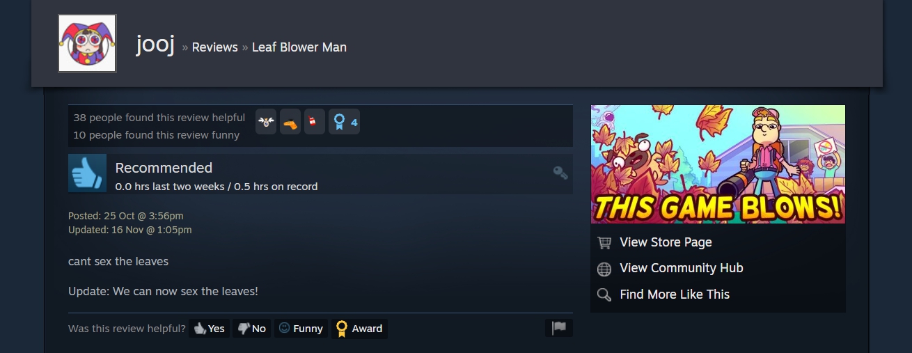 Похоже, разработчики юмористической экшен-аркады «Листогон» (Leaf Blower Man: This Game Blows!) очень внимательно относятся к отзывам своих игроков. Проект с «очень положительными» оценками может порадовать поклонников как DLC «Удаление игры», так и дополнением «Дополнение "Песик"». Однако не все геймеры остались довольны предложенными возможностями: