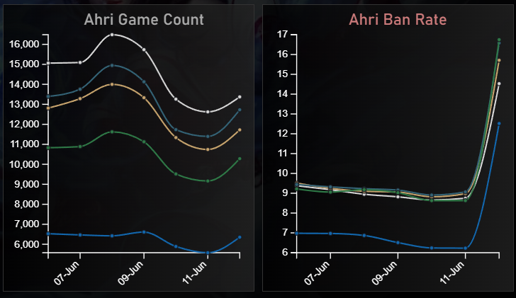Игроки обратили внимание на увеличившееся число банов Ари, довольно сильного и полезного персонажа в League of Legends. Все потому, что с 12 июня стал доступен платный скин для героя, который оценивается в 500 долларов, что больше 40 тысяч рублей. Обратите внимание на резкий рост графика Ahri Ban Rate.