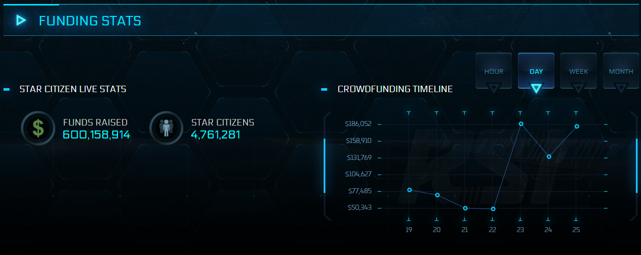 На портале Star Citizen обновился счетчик. Теперь он показывает, что на разработку игры было собрано свыше 600 миллионов долларов. Этой цифры удалось достичь благодаря 4 761 281 человеку, которые до сих пор не знают дату релиза игры.