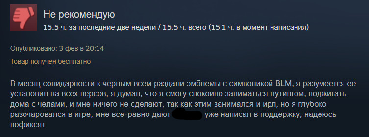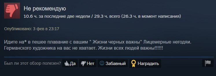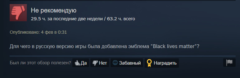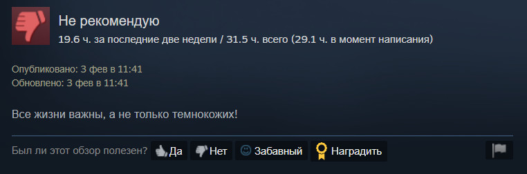 Недовольство игроки выразили несколькими доступными способами. Часть отправилась в Steam, где стала ставить игре плохую оценку и сообщать о том, что «все жизни важны».