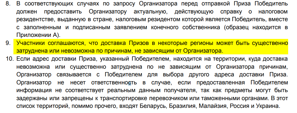 Доставляются ли призы в Россию, неизвестно. В правилах точной информации нет. Но CDPR отмечает, что доставка может быть затруднена в некоторые регионы.