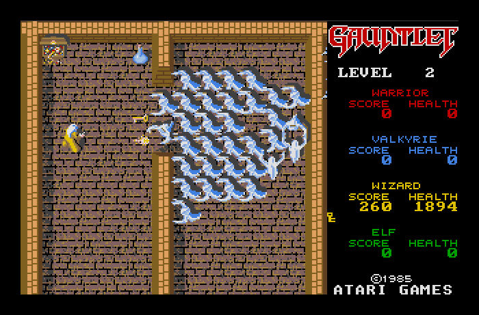 В двух словах не описать то, насколько популярным времяпрепровождением среди молодежи восьмидесятых были игровые автоматы. Целыми днями ребята от мала до велика просаживали деньги и время в аркадных игровых залах. Набивание очков в «Pac-Man», «Galaxian», «Spy Hunter» и иже с ними было целым культом. Разумеется, сейчас это считается чем-то наивным или даже примитивным, но в восьмидесятые это был настоящий «кровавый спорт». Уже тогда игры выпускались с оглядкой на аудиторию с самыми разными вкусовыми пристрастиями: для любителей фантастики выходила масса космических «стрелялок», для поклонников боевиков хватало разномастных шутеров, для людей склонных к созиданию в избытке выходили всякого рода тетрисоподобные развлечения, и так далее. В 1985 году из-под крыла небезызвестной Atari Games (одна из двух фирм, которые появились после развала Atari) вышла игра, созданная, в первую очередь, для поклонников Толкиена и Говарда и просто фанатов «меча и магии» — «Gauntlet». В игре впервые был продемонстрирован кооперативный игровой процесс, рассчитанный на четырех игроков, что мигом привлекло к ней внимание завсегдатаев игровых клубов.