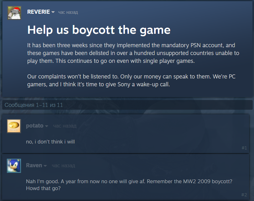 Требование Sony уже вызвало возмущения на страницах обсуждения Steam. Но, как показала история с Ghost of Tsushima, шансы на бойкот малы. Например, в этой теме пользователь слезно пишет «помочь бойкотировать игру», на что получает ответы в стиле «Не, не думаю, что я буду это делать. Я куплю Deluxe».